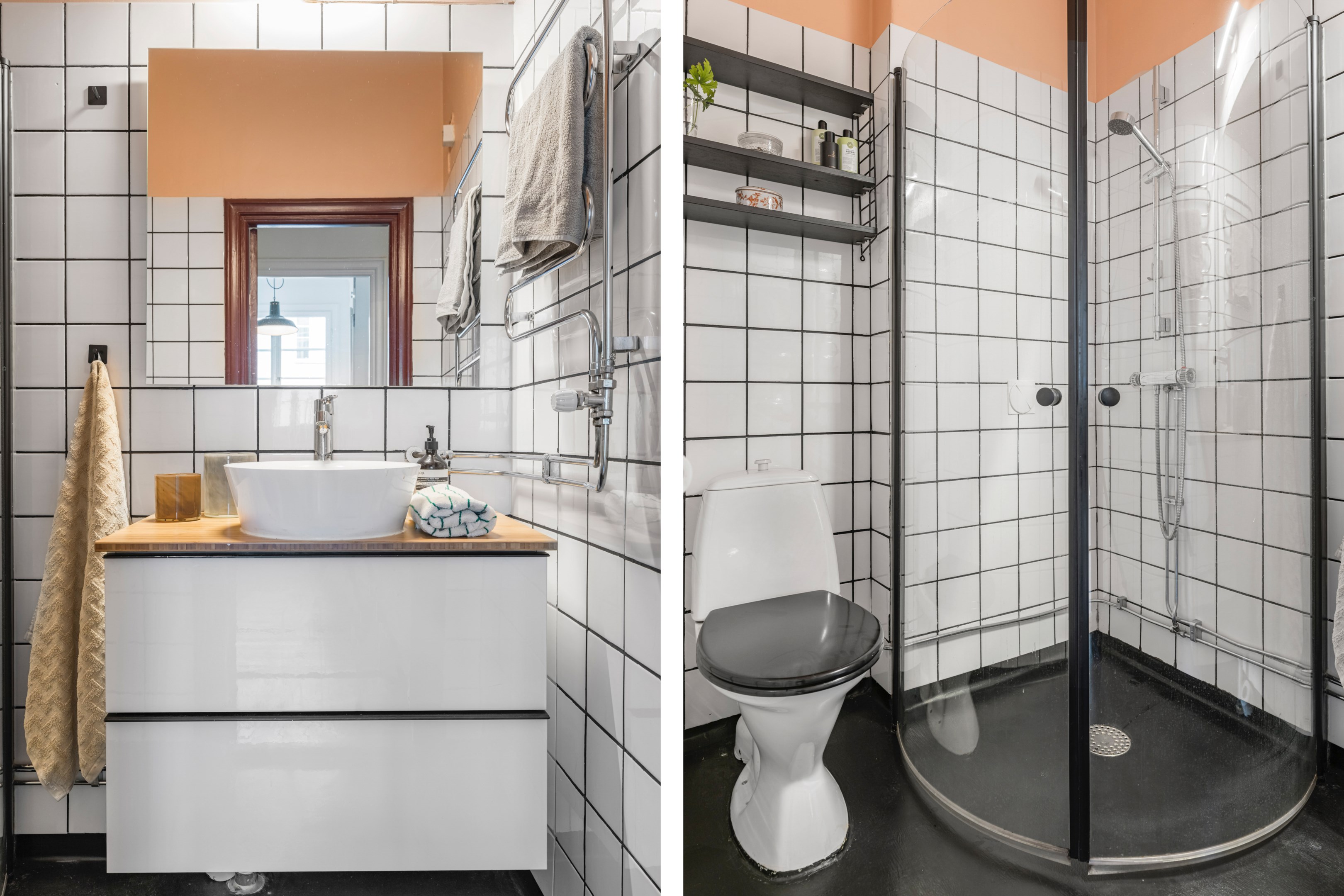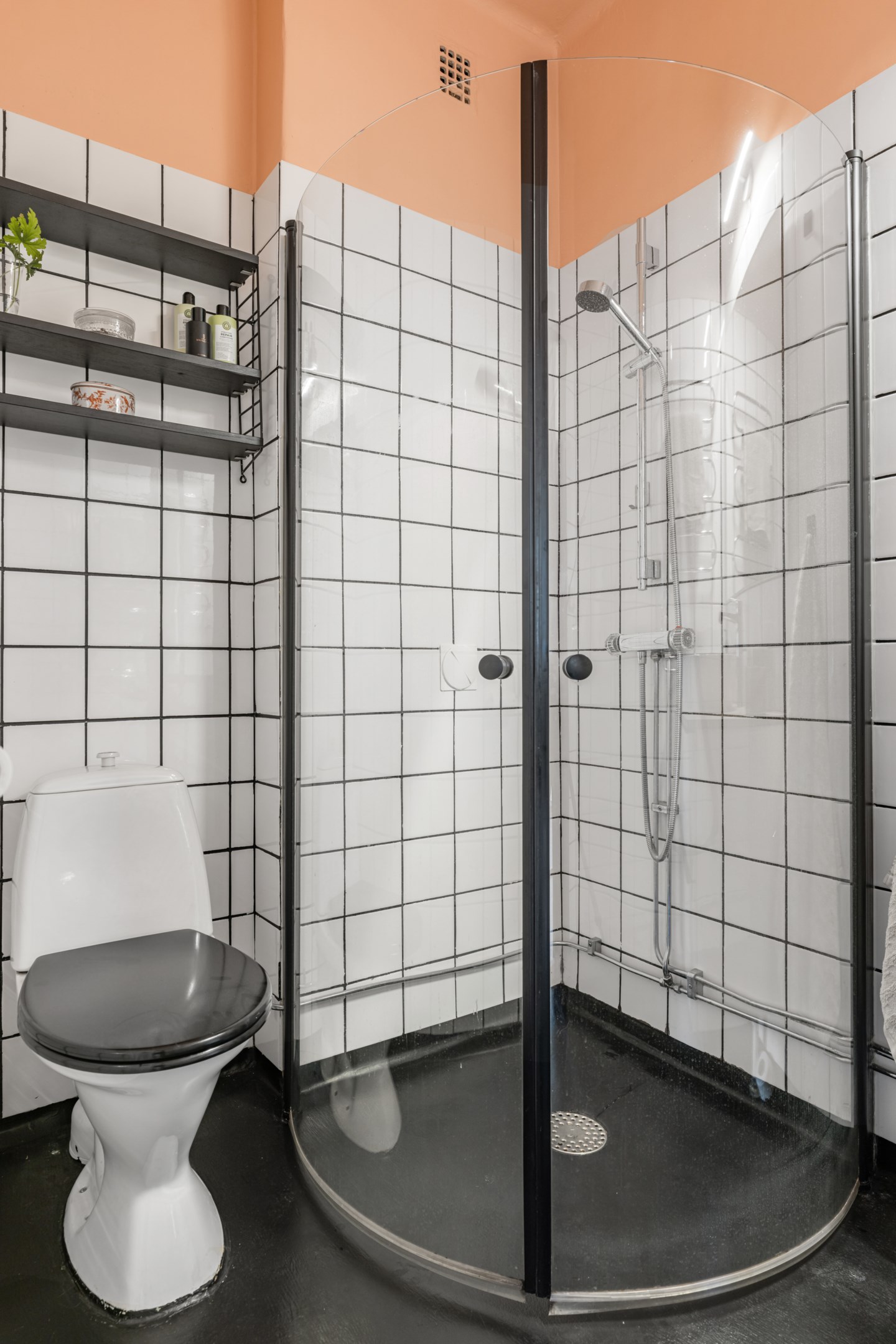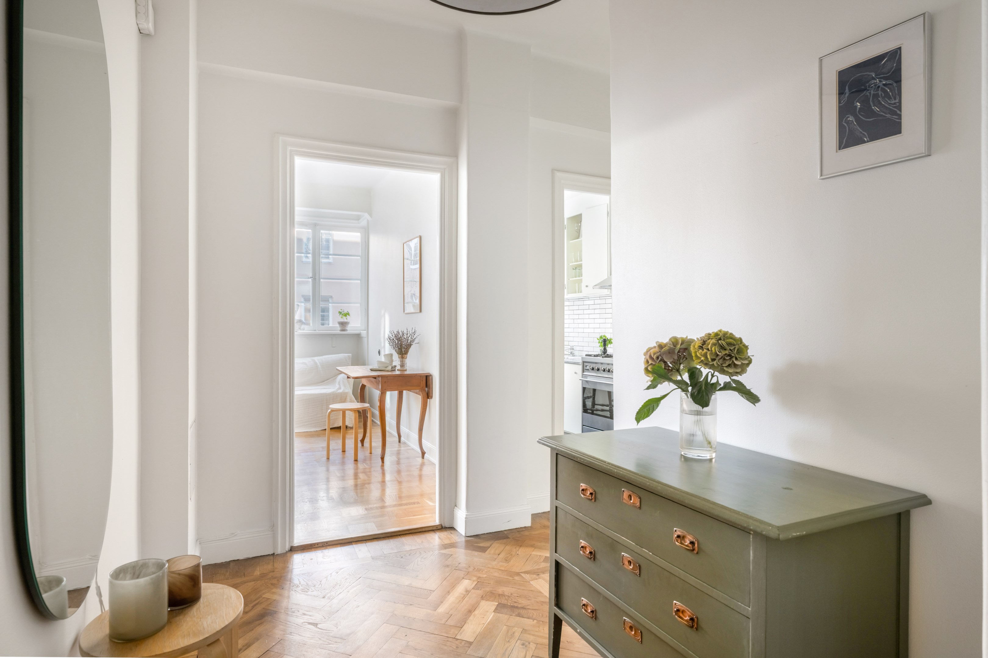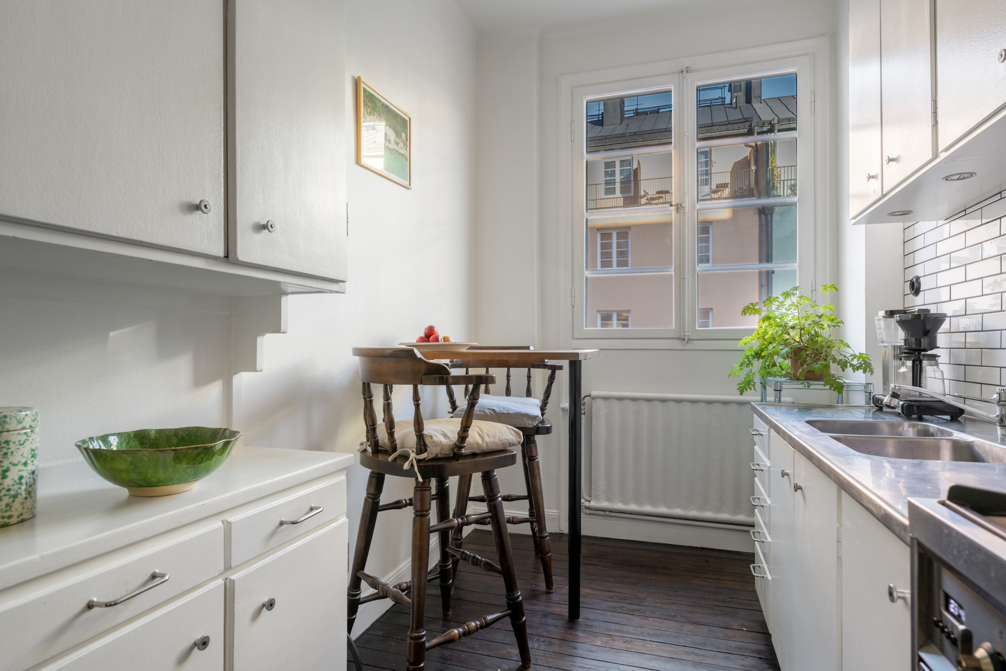 HALL Välkomnande hall med gott om plats för avhängning av ytterkläder. Här finns en platsbyggd hatthylla samt klädkammare. Det finns utrymme för hallmöbel eller mindre arbetsplats. I vinkel finns en inre hall, mellan kök och badrum, med ytterligare klädkammare. Lägenhetsdörren är en säkerhetsdörr. Väggarna är målade i vit kulör och golvet en vacker fiskbensparkett i ek. KÖK Ett stilrent kök med gott om plats för förvaring i över- och underskåp samt serveringsskåp. Diskbänken är i rostfritt stål. Stänkskydd och väggpartier ovan i vit kakel i band med svart fog. Det finns kombinerad kyl/frys, gasspis med ugn i rostfritt, fläkt samt ho och blandare. Här finns matplats för två. Köket är ljust och luftigt med ingång från hallen. Mycket fint ljusinsläpp från spröjsade fönster med fin utsikt mot motstående fasad och balkonger. Väggar och köksluckor är vitmålade, golvet är ett gammalt fint svartlackat furugolv. BADRUM Badrummet är väl tilltaget och rymmer wc, dusch och handfat med kommod samt spegel och handdukstork. Väggarna är kaklade i vitt och golvet är svartmålat. VARDAGSRUM/SOVRUM Ett underbart vardagsrum som flödar i ljus från tre fönsterpartier med spröjs. Rummets karaktär ger gott om utrymme för varierat möblemang, såsom soffgrupp och sovplats (skena i taket skärmar av fint om man önskar). Det finns ett trevligt burspråk, samt pardörrar med spröjs ut på den fina balkongen. Väggarna är vitmålade och golvet vacker holländsk parkett i ek. BALKONG Balkongen nås via vackra pardörrar och har en härlig delvis fri sikt samt över motstående husfasad, balkong och himmel. Här finns plats för två att äta och njuta en fantastisk atmosfär! FÖRRÅD Ägare av bostaden disponerar även ett källarförråd.