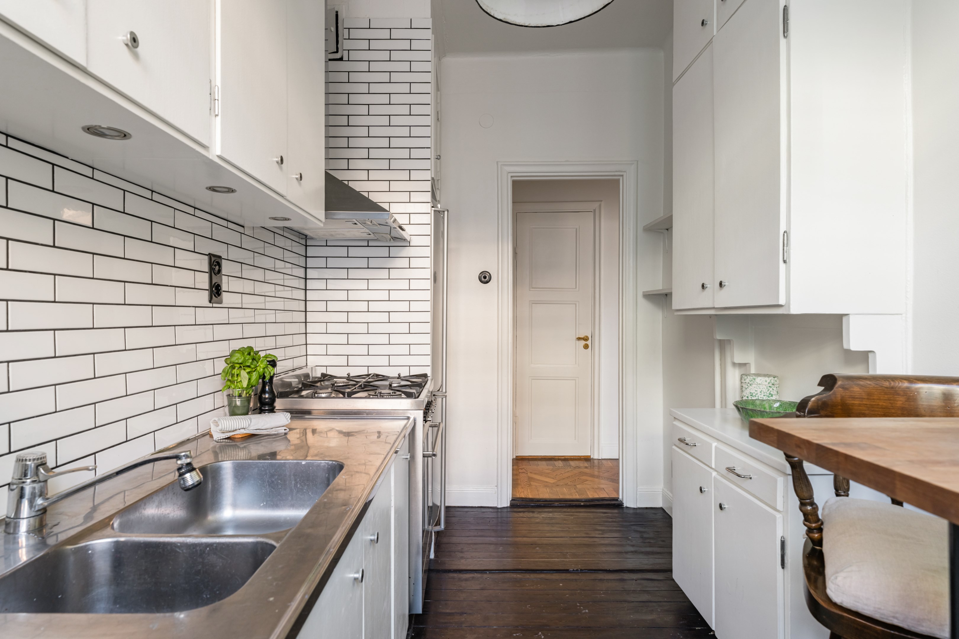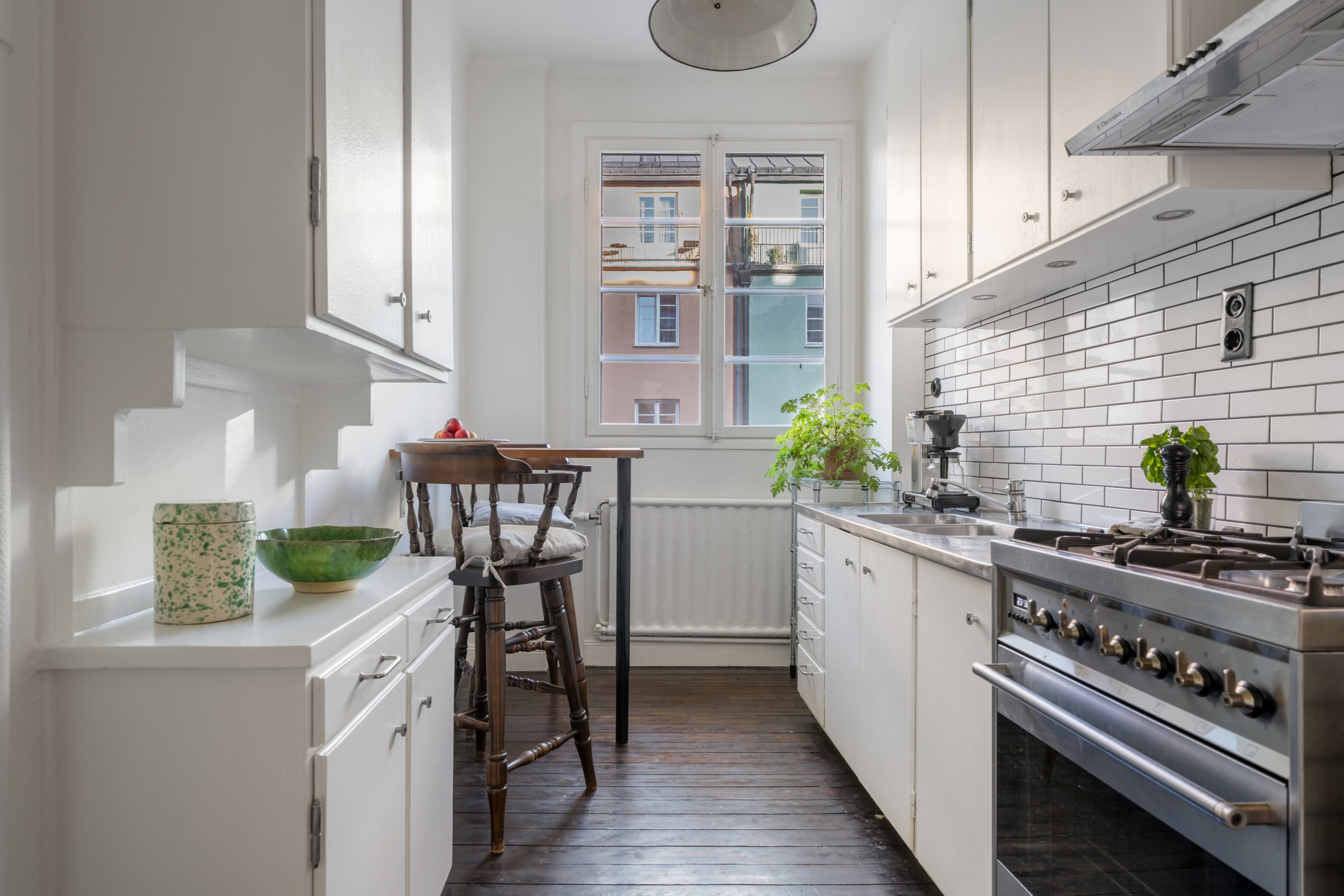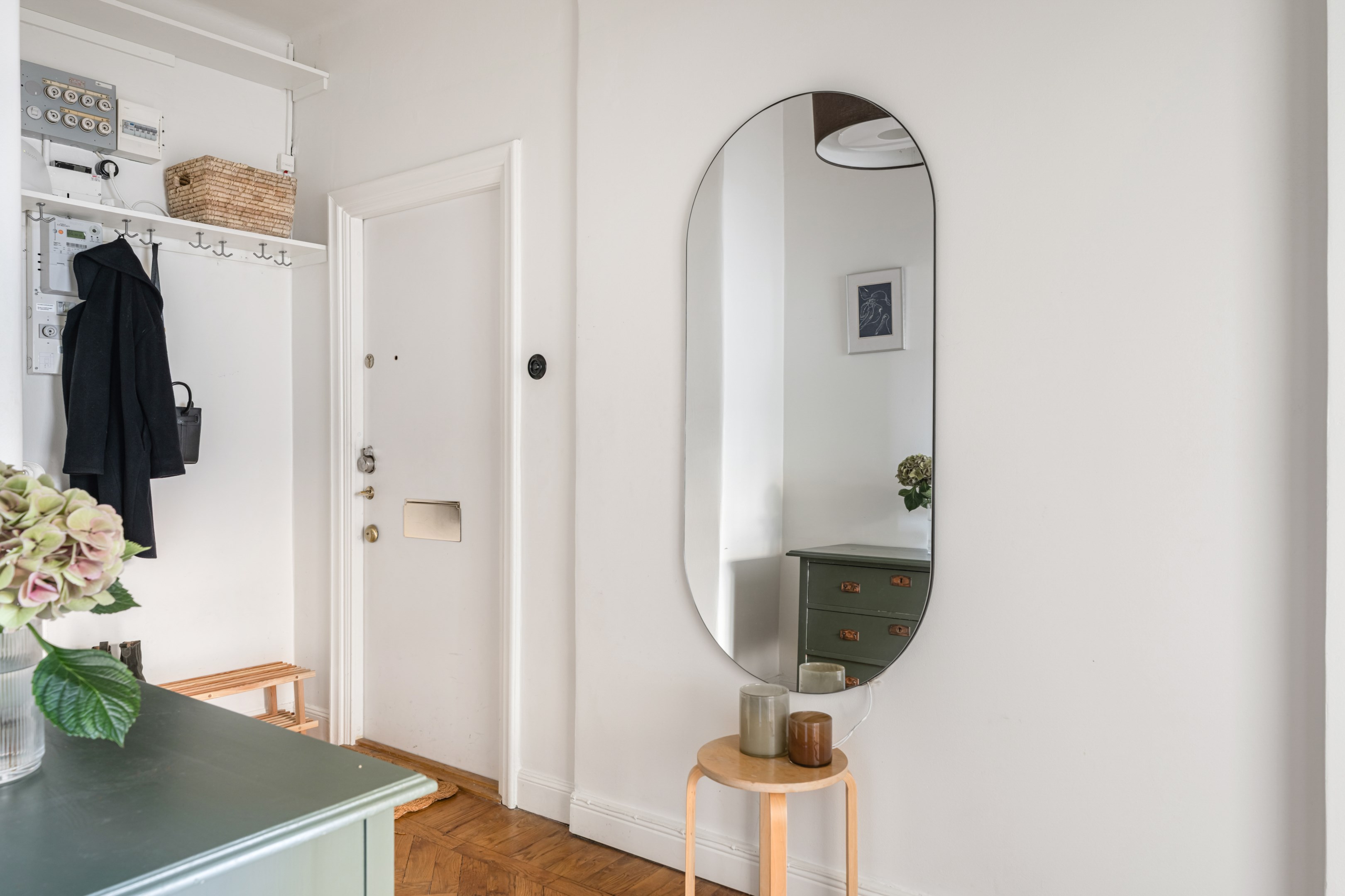 HALL Välkomnande hall med gott om plats för avhängning av ytterkläder. Här finns en platsbyggd hatthylla samt klädkammare. Det finns utrymme för hallmöbel eller mindre arbetsplats. I vinkel finns en inre hall, mellan kök och badrum, med ytterligare klädkammare. Lägenhetsdörren är en säkerhetsdörr. Väggarna är målade i vit kulör och golvet en vacker fiskbensparkett i ek. KÖK Ett stilrent kök med gott om plats för förvaring i över- och underskåp samt serveringsskåp. Diskbänken är i rostfritt stål. Stänkskydd och väggpartier ovan i vit kakel i band med svart fog. Det finns kombinerad kyl/frys, gasspis med ugn i rostfritt, fläkt samt ho och blandare. Här finns matplats för två. Köket är ljust och luftigt med ingång från hallen. Mycket fint ljusinsläpp från spröjsade fönster med fin utsikt mot motstående fasad och balkonger. Väggar och köksluckor är vitmålade, golvet är ett gammalt fint svartlackat furugolv. BADRUM Badrummet är väl tilltaget och rymmer wc, dusch och handfat med kommod samt spegel och handdukstork. Väggarna är kaklade i vitt och golvet är svartmålat. VARDAGSRUM/SOVRUM Ett underbart vardagsrum som flödar i ljus från tre fönsterpartier med spröjs. Rummets karaktär ger gott om utrymme för varierat möblemang, såsom soffgrupp och sovplats (skena i taket skärmar av fint om man önskar). Det finns ett trevligt burspråk, samt pardörrar med spröjs ut på den fina balkongen. Väggarna är vitmålade och golvet vacker holländsk parkett i ek. BALKONG Balkongen nås via vackra pardörrar och har en härlig delvis fri sikt samt över motstående husfasad, balkong och himmel. Här finns plats för två att äta och njuta en fantastisk atmosfär! FÖRRÅD Ägare av bostaden disponerar även ett källarförråd.