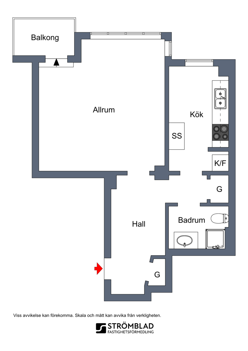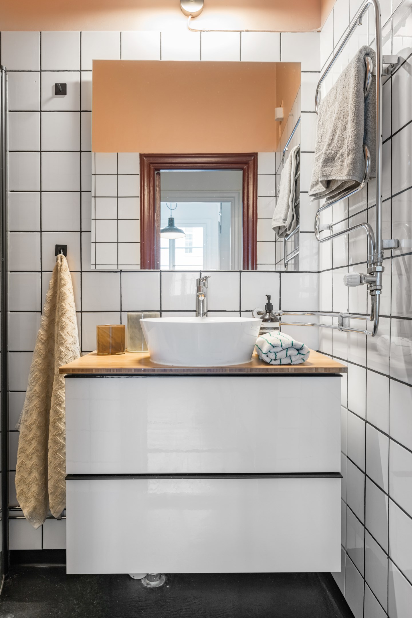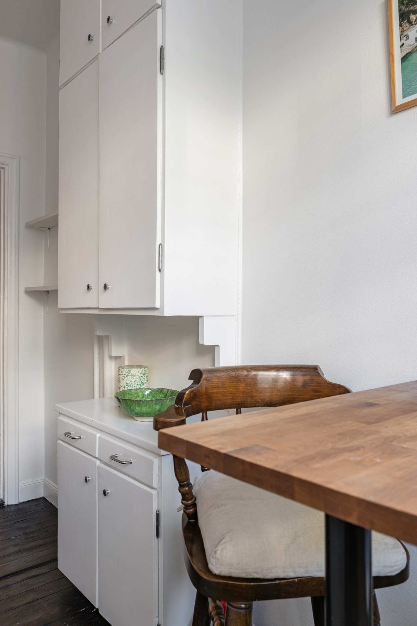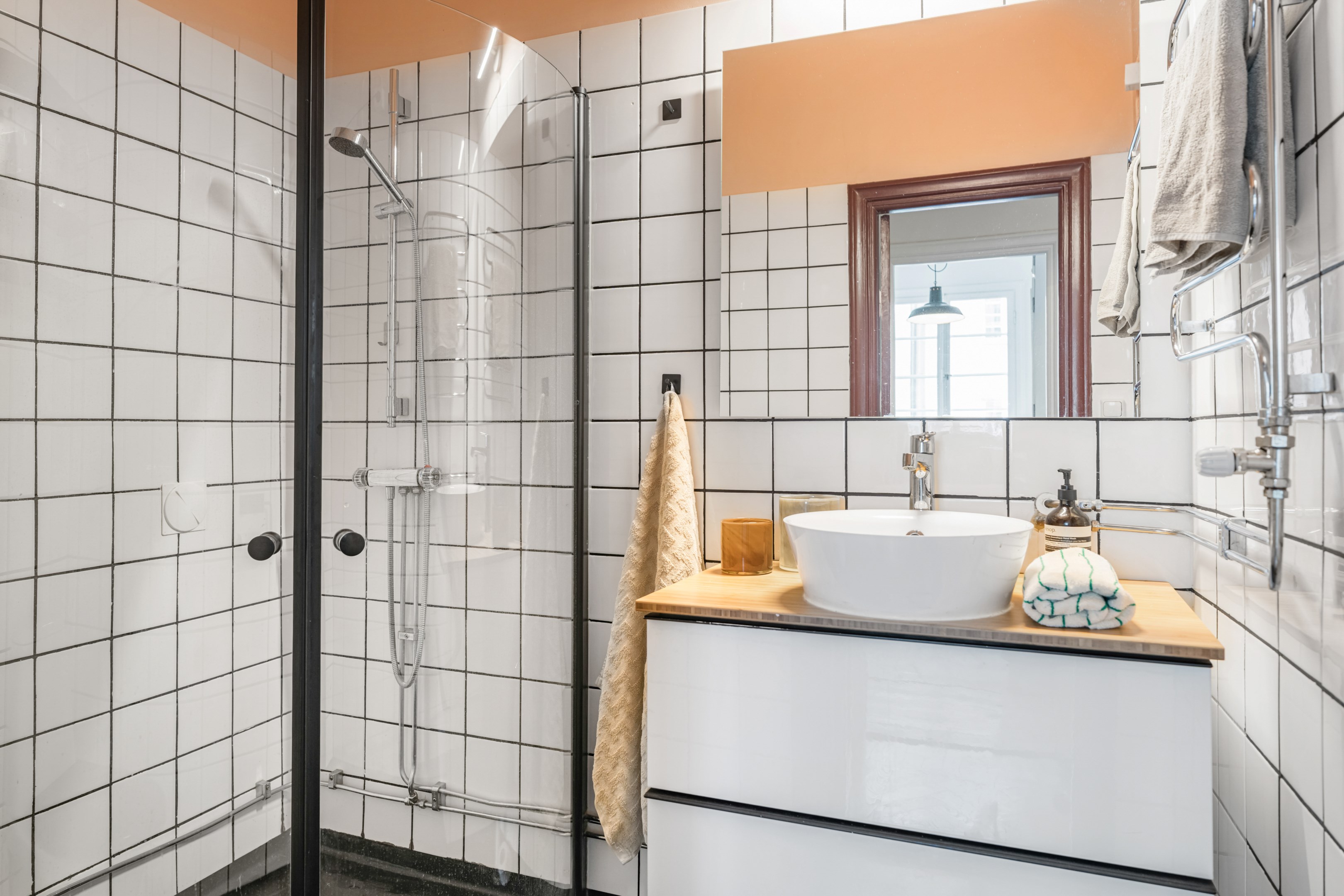 HALL Välkomnande hall med gott om plats för avhängning av ytterkläder. Här finns en platsbyggd hatthylla samt klädkammare. Det finns utrymme för hallmöbel eller mindre arbetsplats. I vinkel finns en inre hall, mellan kök och badrum, med ytterligare klädkammare. Lägenhetsdörren är en säkerhetsdörr. Väggarna är målade i vit kulör och golvet en vacker fiskbensparkett i ek. KÖK Ett stilrent kök med gott om plats för förvaring i över- och underskåp samt serveringsskåp. Diskbänken är i rostfritt stål. Stänkskydd och väggpartier ovan i vit kakel i band med svart fog. Det finns kombinerad kyl/frys, gasspis med ugn i rostfritt, fläkt samt ho och blandare. Här finns matplats för två. Köket är ljust och luftigt med ingång från hallen. Mycket fint ljusinsläpp från spröjsade fönster med fin utsikt mot motstående fasad och balkonger. Väggar och köksluckor är vitmålade, golvet är ett gammalt fint svartlackat furugolv. BADRUM Badrummet är väl tilltaget och rymmer wc, dusch och handfat med kommod samt spegel och handdukstork. Väggarna är kaklade i vitt och golvet är svartmålat. VARDAGSRUM/SOVRUM Ett underbart vardagsrum som flödar i ljus från tre fönsterpartier med spröjs. Rummets karaktär ger gott om utrymme för varierat möblemang, såsom soffgrupp och sovplats (skena i taket skärmar av fint om man önskar). Det finns ett trevligt burspråk, samt pardörrar med spröjs ut på den fina balkongen. Väggarna är vitmålade och golvet vacker holländsk parkett i ek. BALKONG Balkongen nås via vackra pardörrar och har en härlig delvis fri sikt samt över motstående husfasad, balkong och himmel. Här finns plats för två att äta och njuta en fantastisk atmosfär! FÖRRÅD Ägare av bostaden disponerar även ett källarförråd.