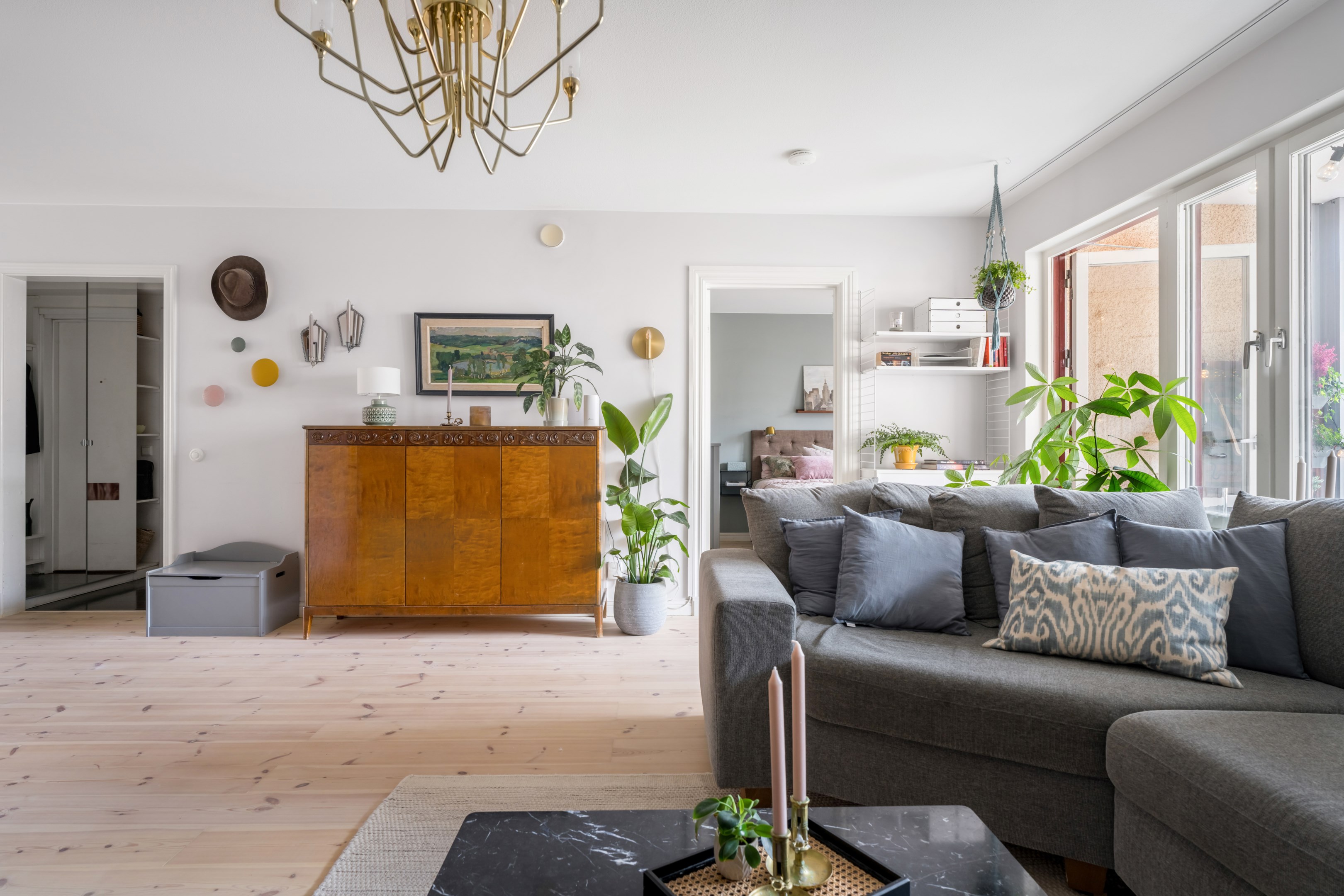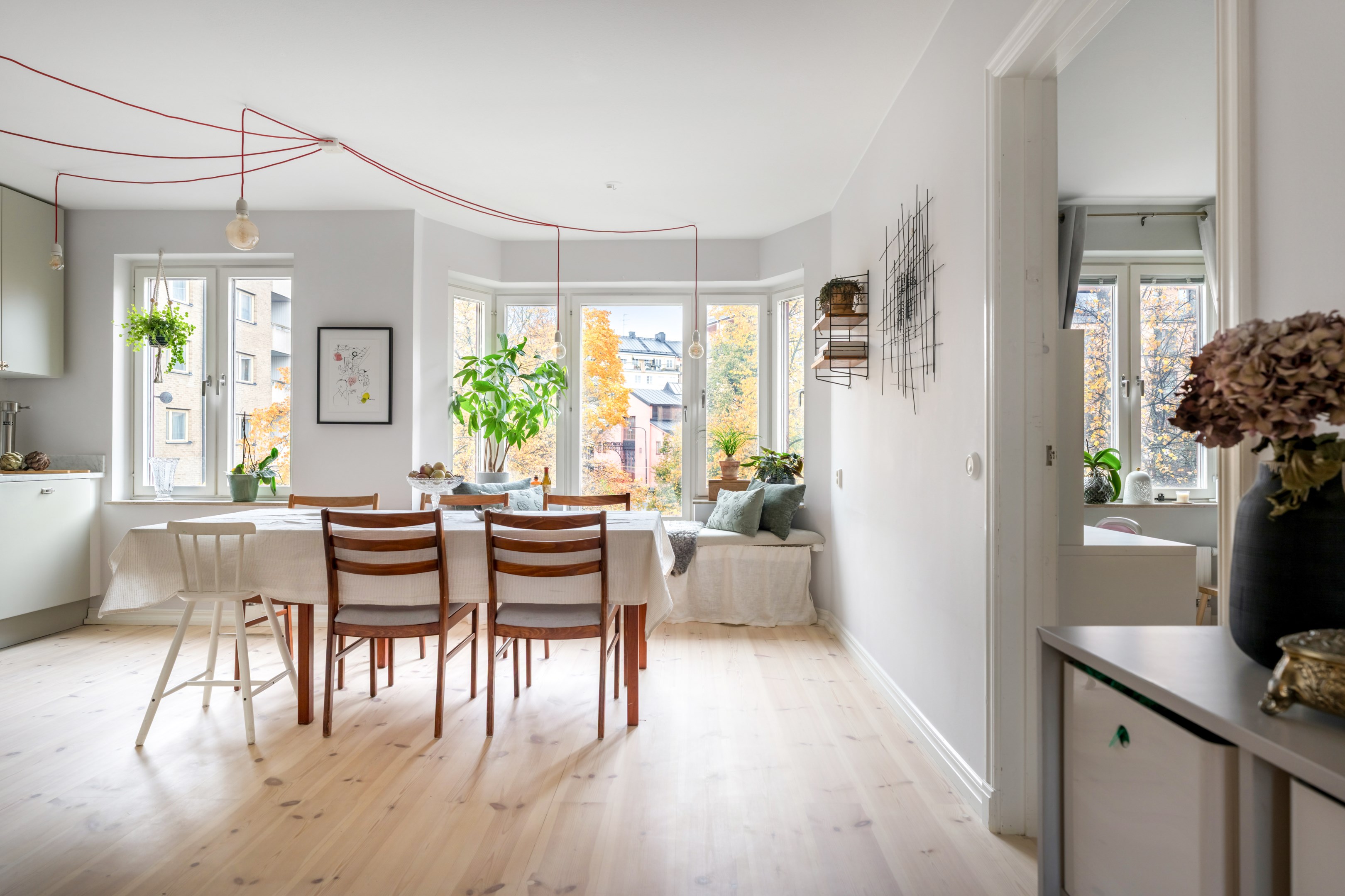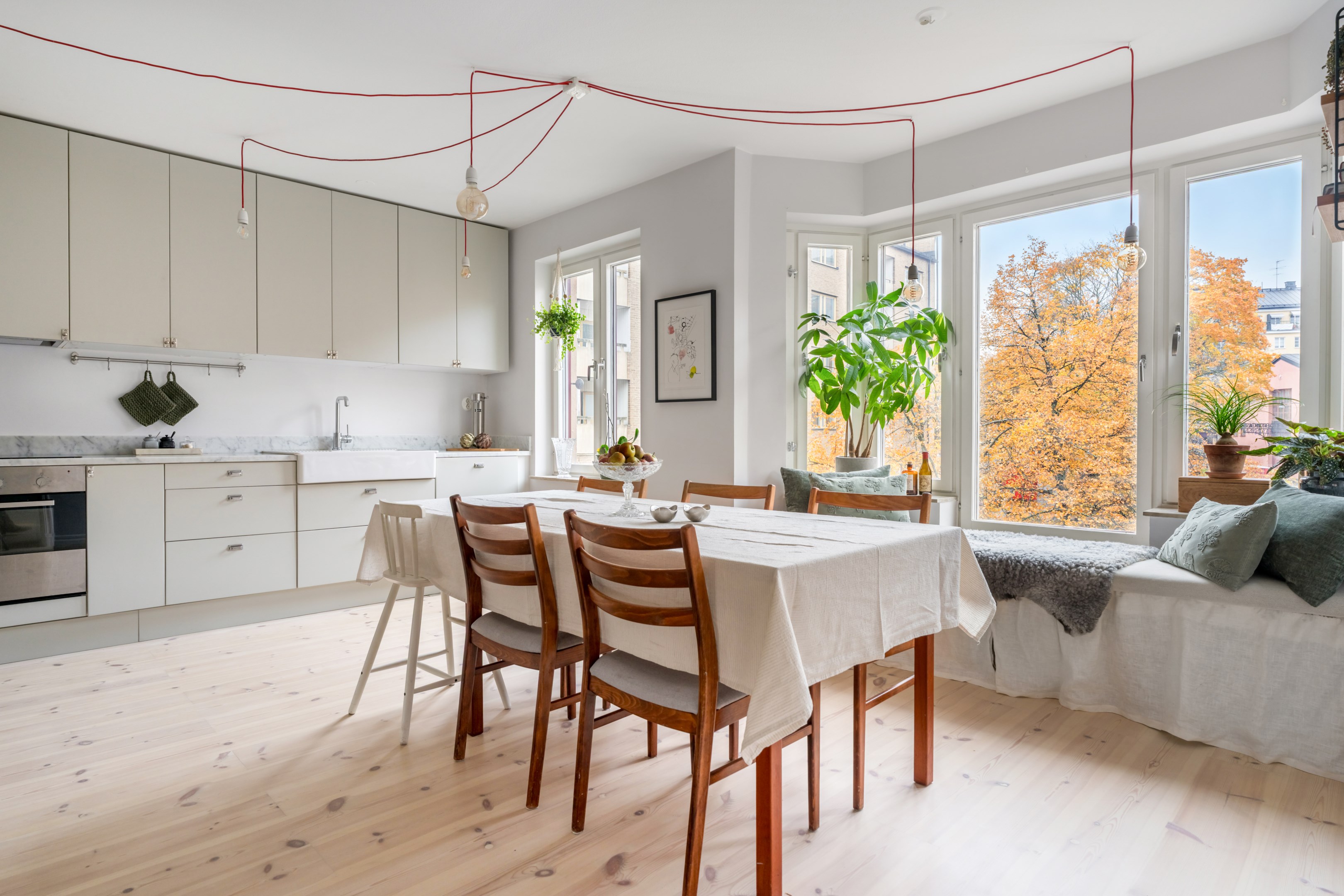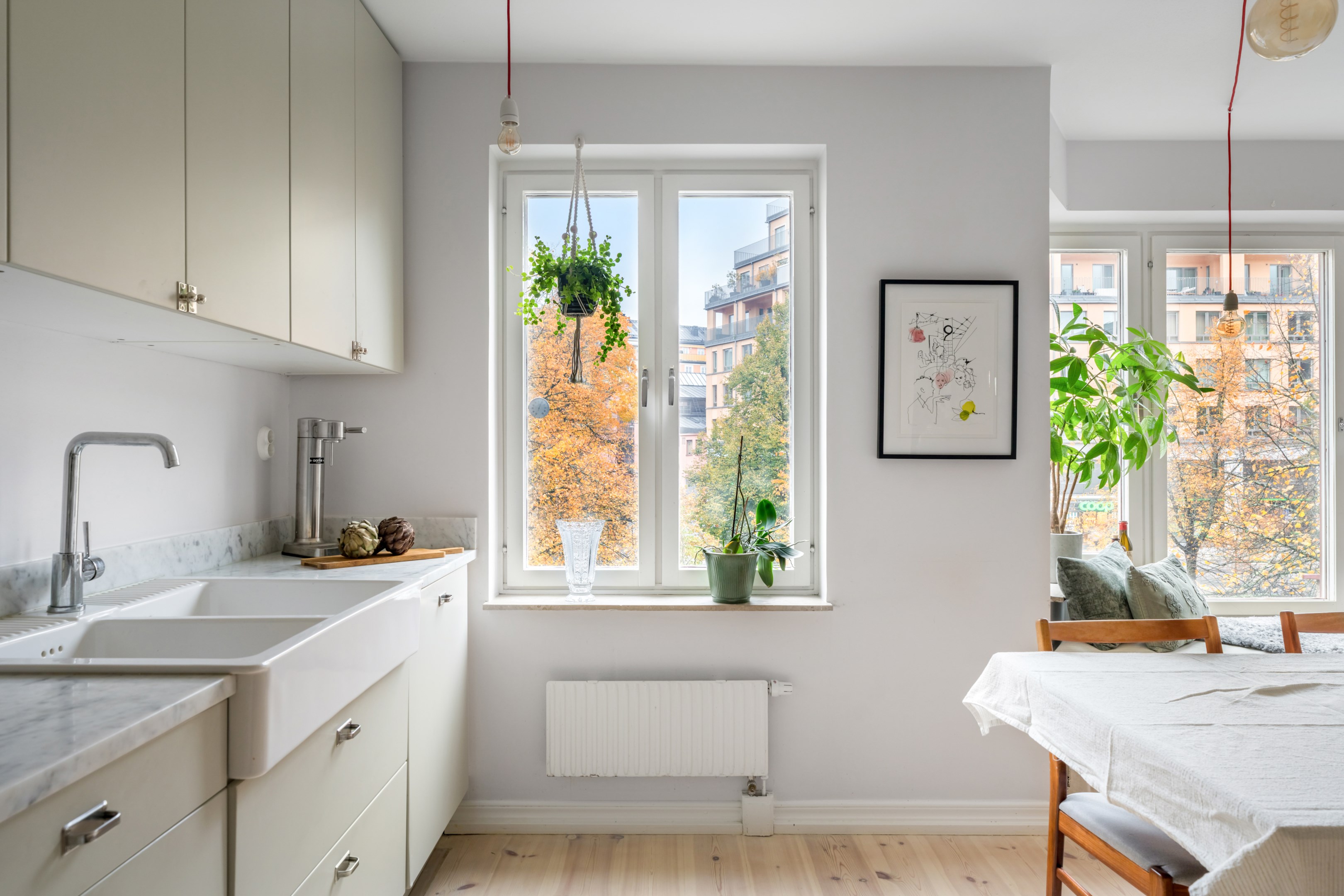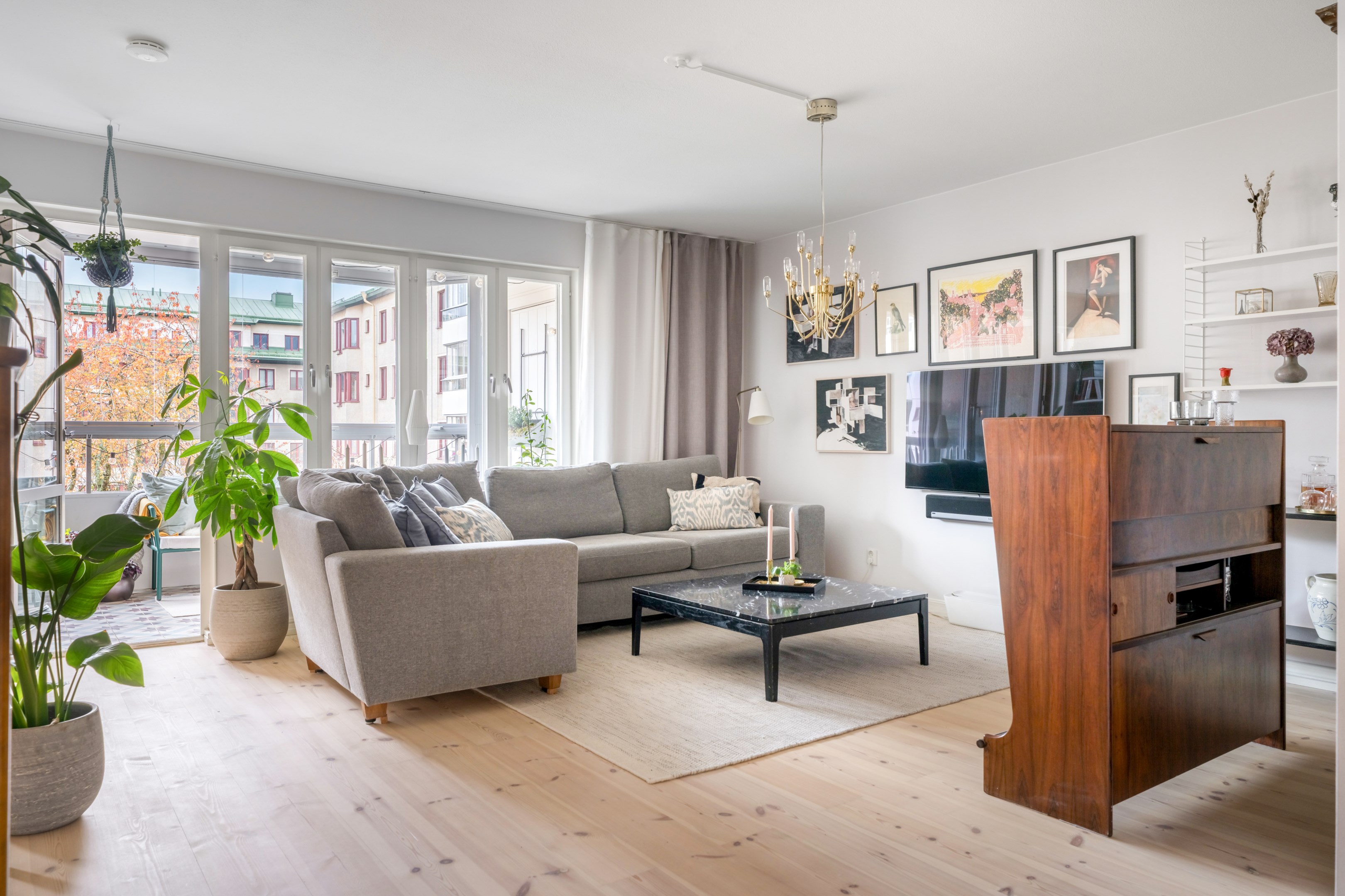 Här är en sällsynt välrenoverad och generös 3-rumslägenhet med fina och påkostade ytskikt och genomgående ljusa kulörer på såväl väggar som golv. Den sociala planlösningen mellan kök och vardagsrum ger ett härligt ljusflöde genom bostaden då den har fönster åt två håll. Stor inglasad balkong. Ljust furuparkettgolv (slipat och pigmenterat med hårdvaxolja 2024) som löper genom alla rum utan trösklar (endast till badrummet). Praktiskt slipat granitgolv i hall och klinkergolv i samma stil i badrum samt balkong (stil Marrakech).