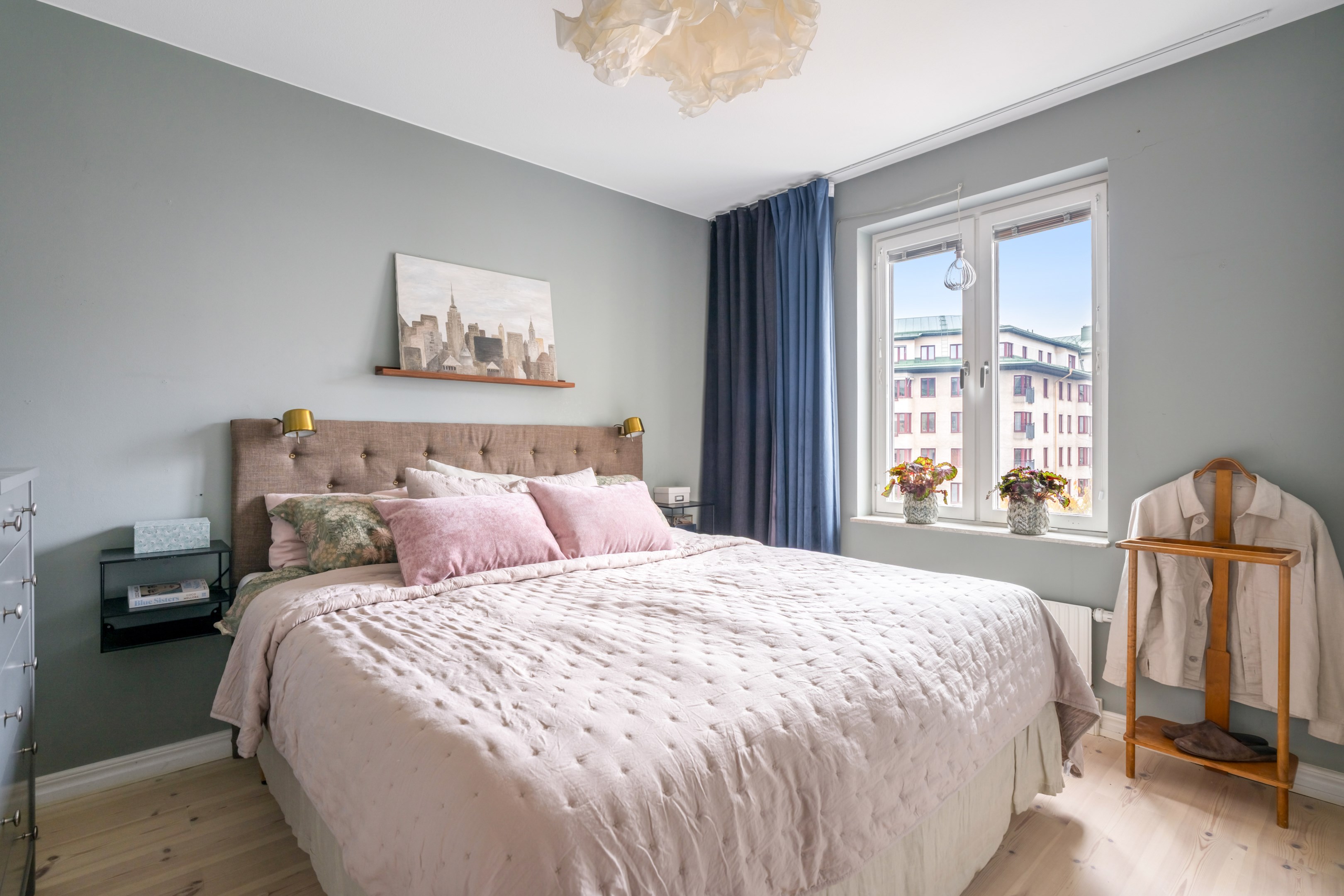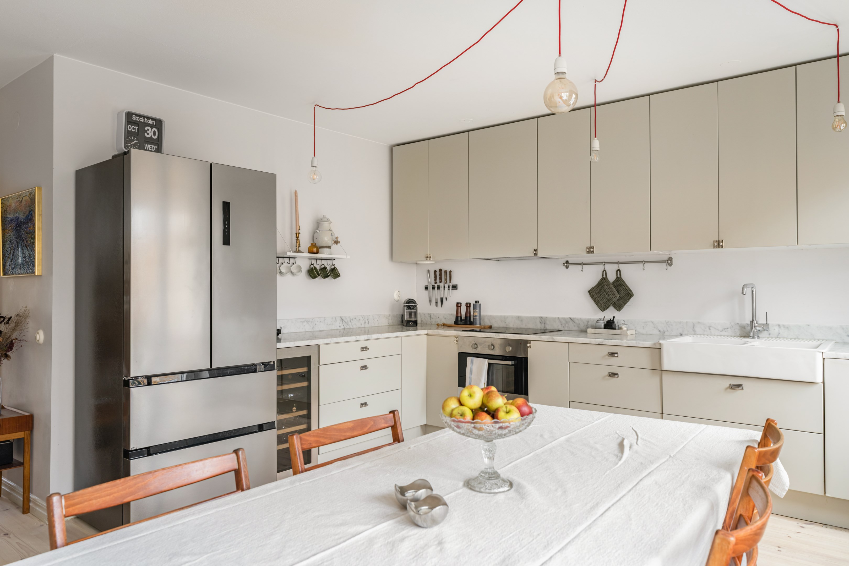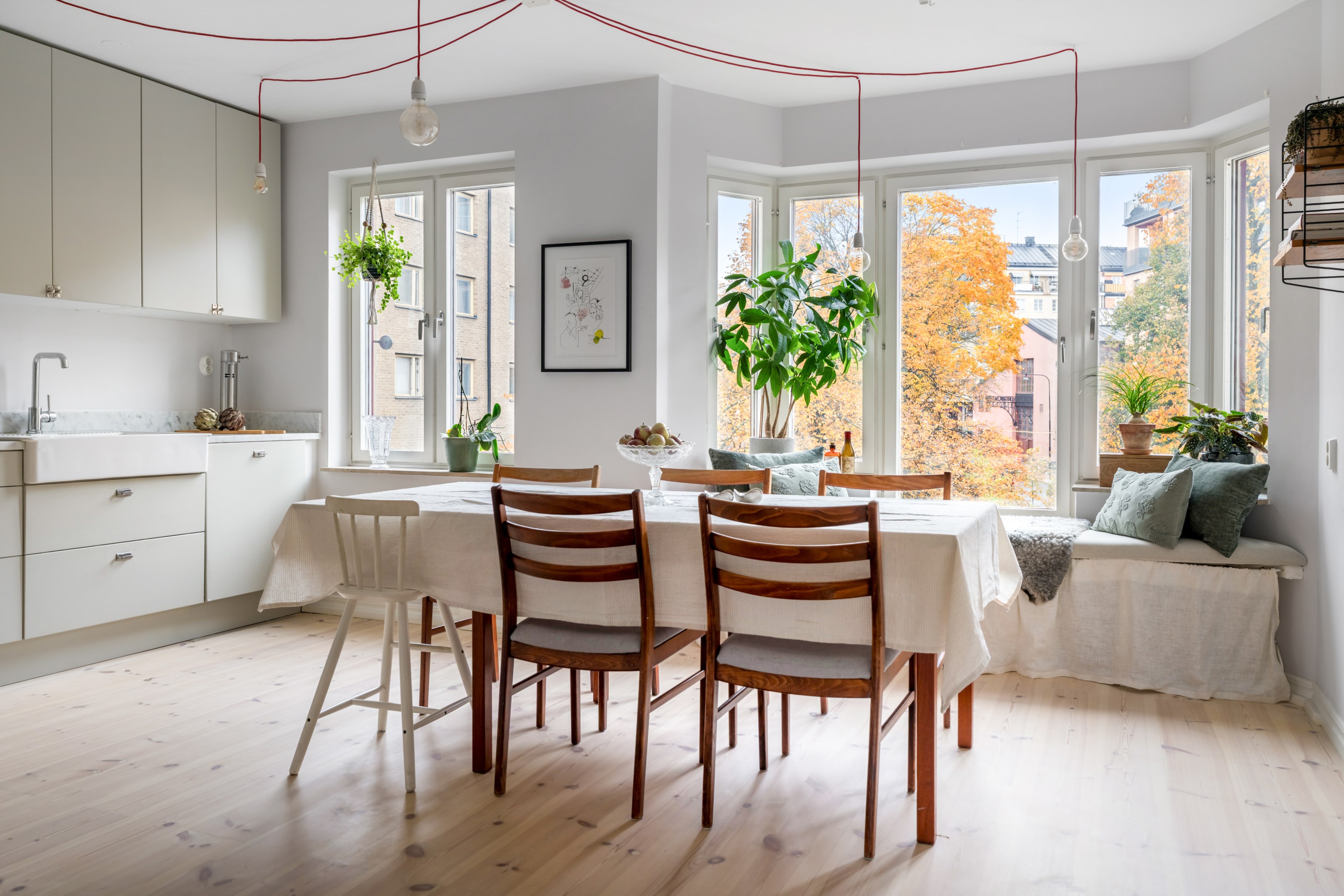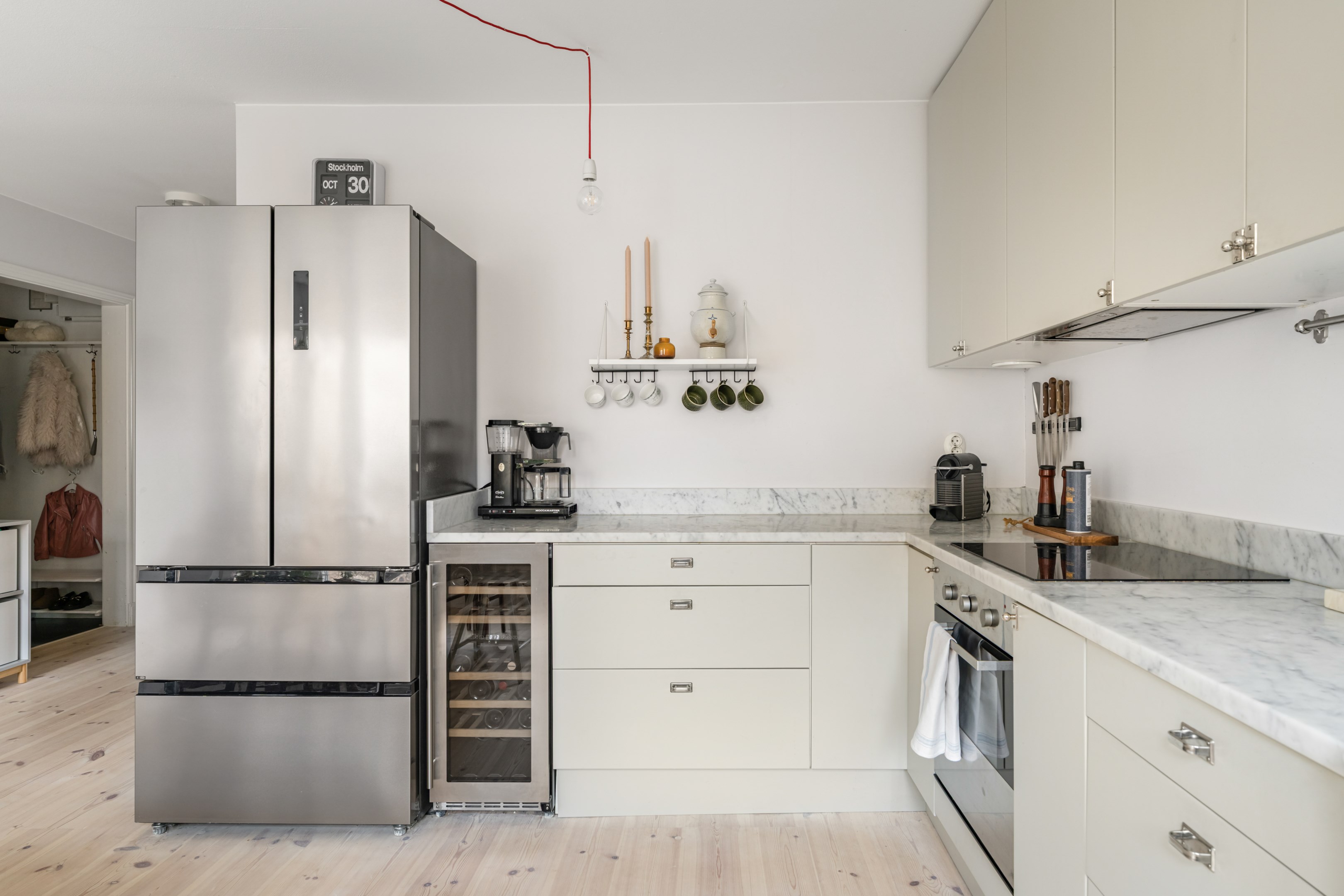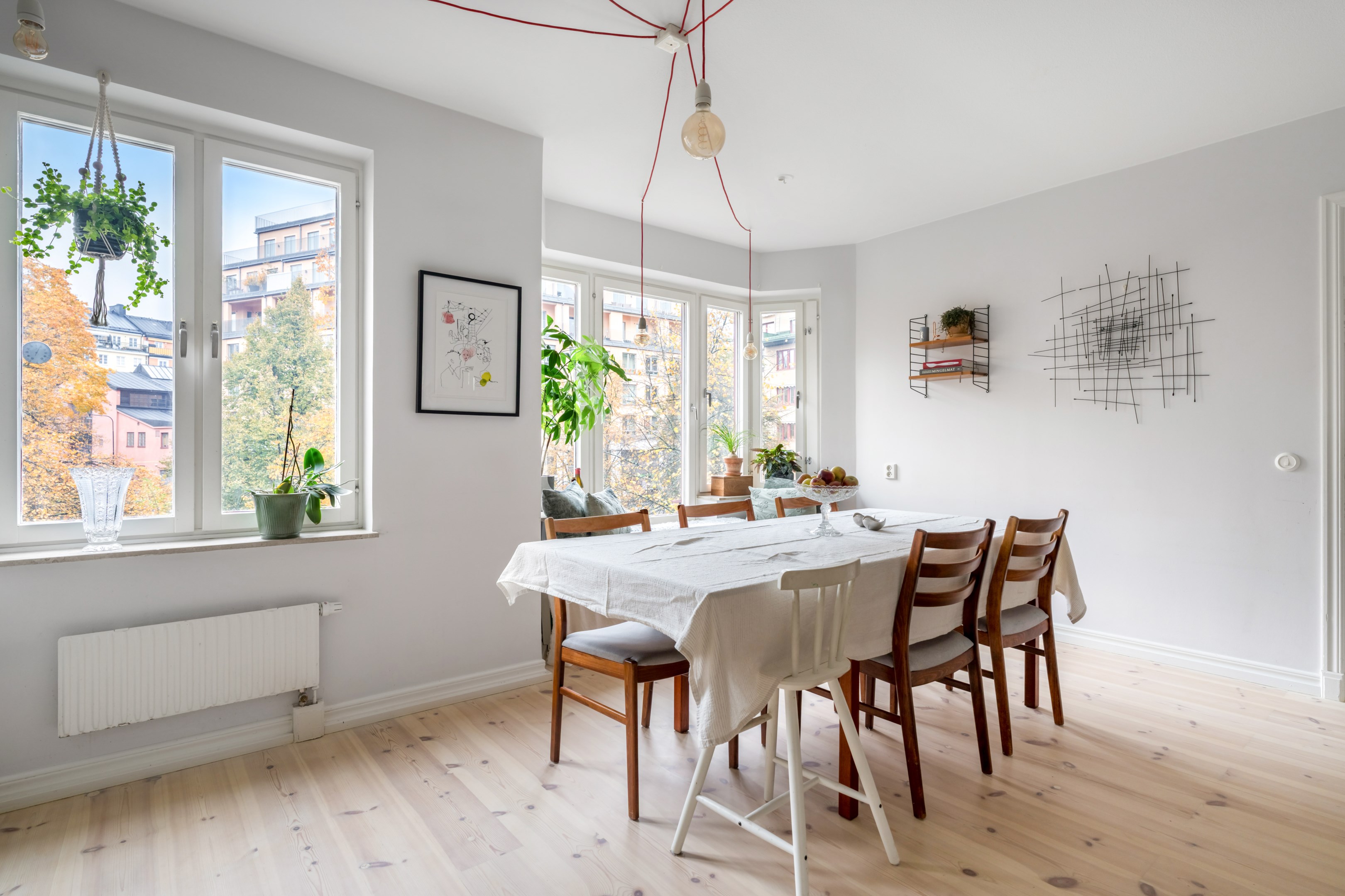 Här är en sällsynt välrenoverad och generös 3-rumslägenhet med fina och påkostade ytskikt och genomgående ljusa kulörer på såväl väggar som golv. Den sociala planlösningen mellan kök och vardagsrum ger ett härligt ljusflöde genom bostaden då den har fönster åt två håll. Stor inglasad balkong. Ljust furuparkettgolv (slipat och pigmenterat med hårdvaxolja 2024) som löper genom alla rum utan trösklar (endast till badrummet). Praktiskt slipat granitgolv i hall och klinkergolv i samma stil i badrum samt balkong (stil Marrakech).