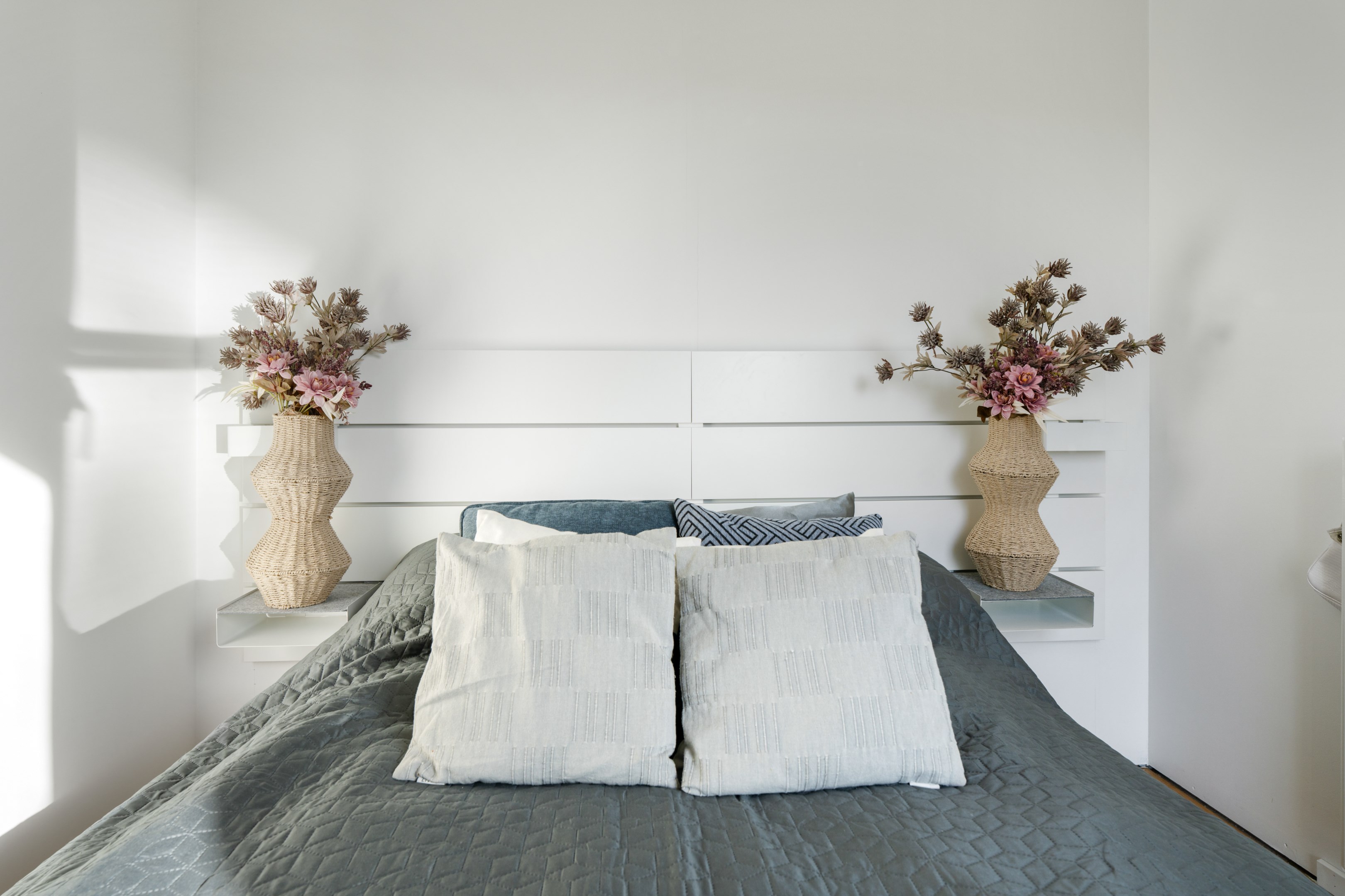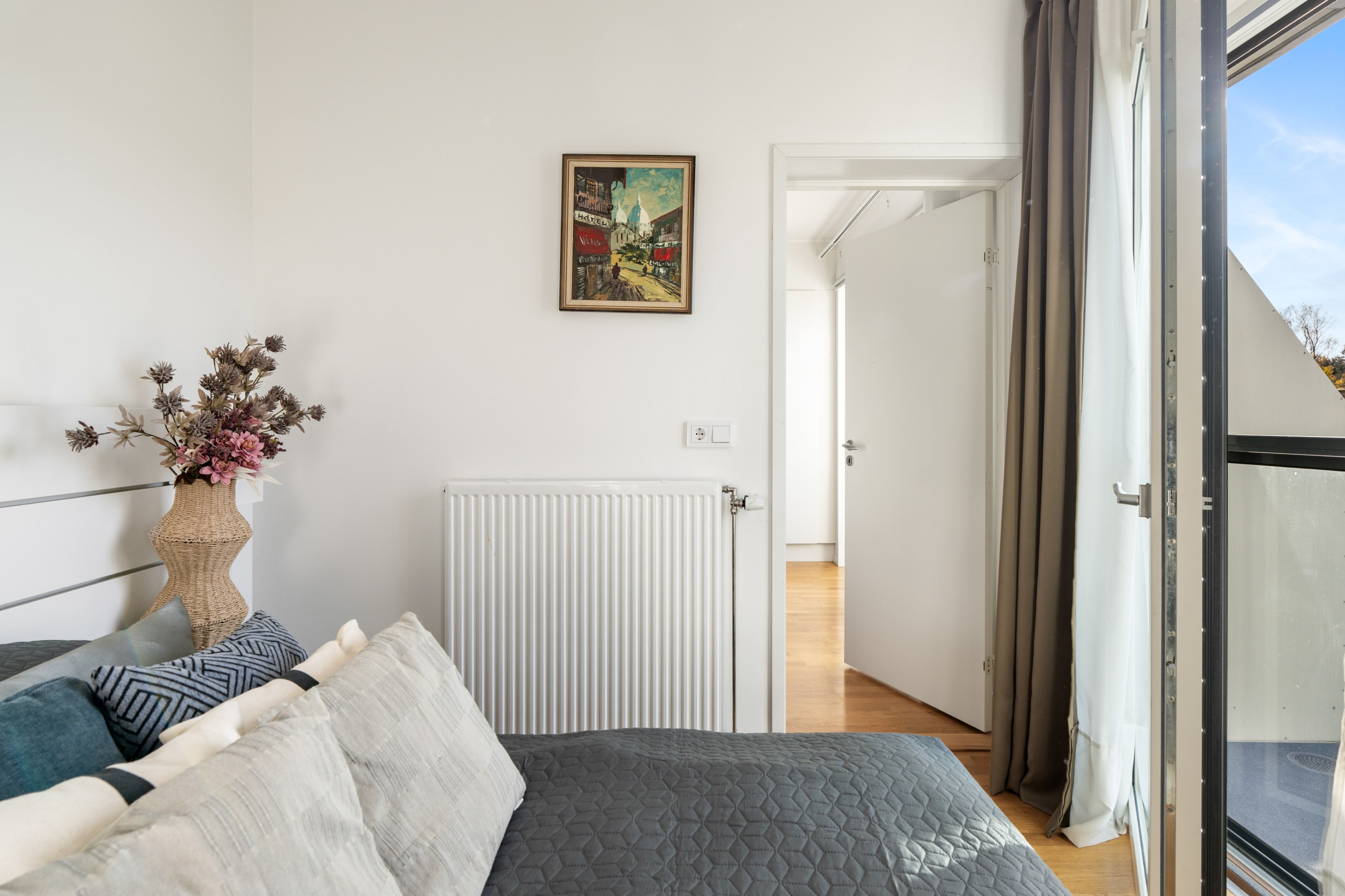 ENTRÉ Vid den helt öppna entrén öppnar sig den ljusa moderna bostaden och utsikten genom stort fönsterparti och stor balkong över låg bebyggelse med sedumtak och himmel. KÖKS OCH VARDAGSRUM I ÖPPEN PLANLÖSNING KÖKSDEL Köksdelen är öppen och rymmer en komplett och modern utrustning med gott om utrymme för förvaring i över- och underskåp med köksluckor i vitt. Här finns gott om plats för matbord för flera. Det finns kyl/frys, häll/ugn, fläkt, ho samt diskmaskin och mikro. Stänkskyddet är kaklat i vitt och bänkskivan i ljus laminat. VARDAGSRUMSDEL Här finns gott om möjligheter att möblera för ett socialt umgänge. Det finns ett stort fönsterparti med utgång till en stor balkong som vetter mot låg radhusbebyggelse med sedumtak. Fantastiskt sydvästlig läge! Väggarna är målade i vitt och golvet är ett fint lackat ekparkettgolv. SOVRUM Sovrummet är yteffektivt och rymmer dubbelsäng. Fint ljusinsläpp genom fönstret med fransk balkong från golv till tak . Väggarna är vitmålade och golvet lackat ekparkettgolv. BADRUM Badrummet är rymligt och har gott om plats för förvaring. Det finns dusch med snygg glasvägg, wc, handdukstork, handfat med kommod och spegelskåp. Det finns en TM/TT 'side by side' med arbetsbänk och skåp ovanför, samt fin och praktisk vägghylla. Badrummet är helkaklat i vitt och golvet sobert grått klinkergolv. Golvvärme. BALKONG Balkongen är stor och möblerbar med en underbart sydvästligt fritt läge. Utsikten är mot låg radhusbebyggelse, sedumtak och himmel. Delvis frostat glas inger ytterligare en känsla av ostördhet. FÖRRÅD Förrådet är praktiskt och rymligt och ligger i bostaden. Kom och upplev denna trivsamma bostad!